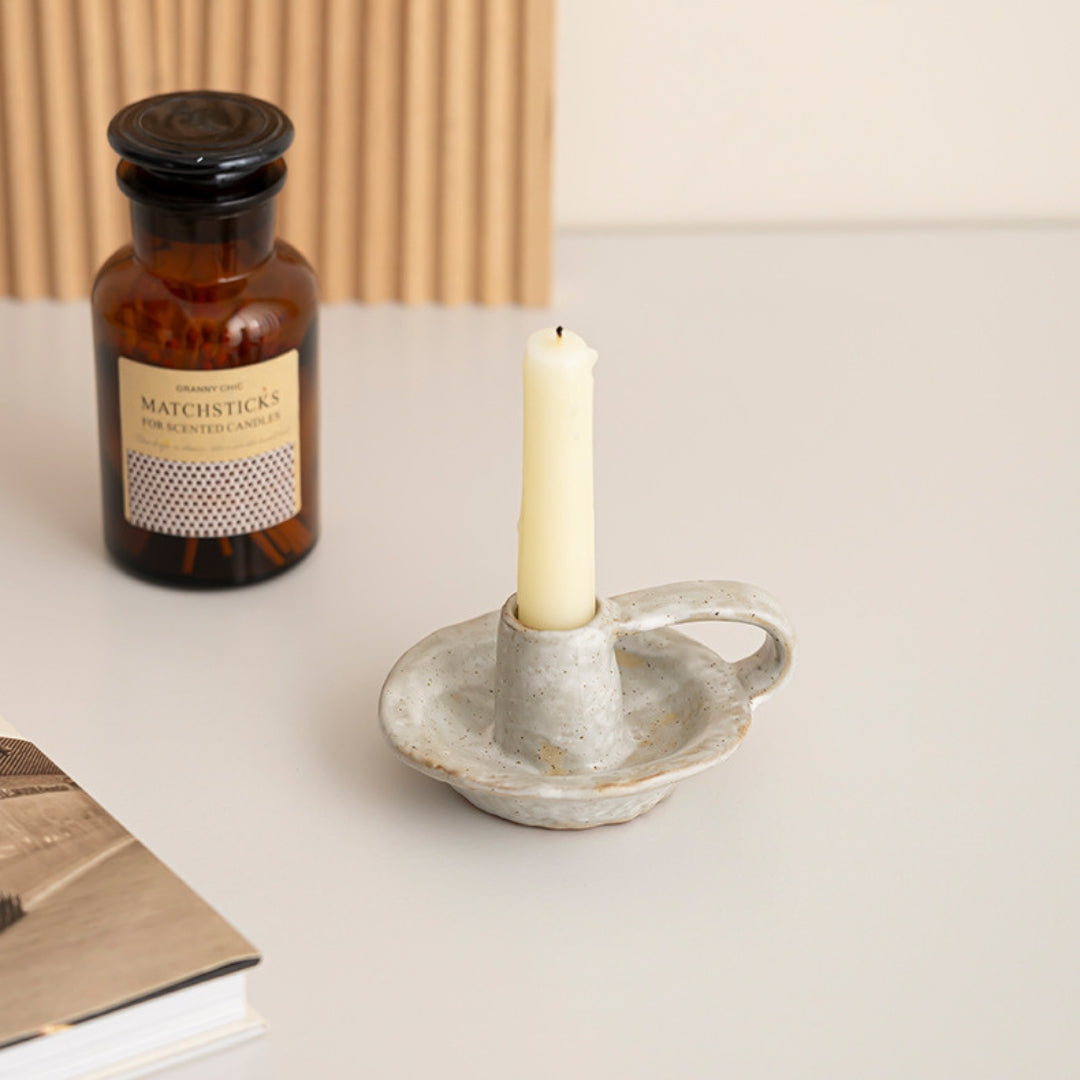 A handcrafted ceramic candleholder with a looped handle and speckled glaze. Its wide, dish-style base adds nostalgic charm and function — perfect for taper candles or as a sculptural accent on shelves, nightstands, or tables.